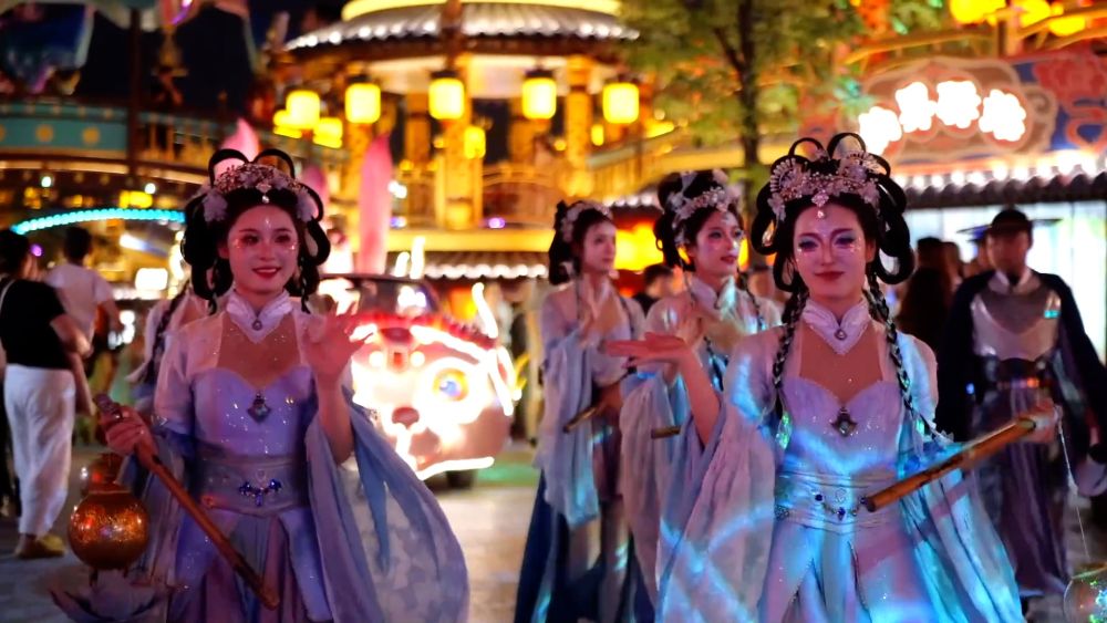 夜幕下的万岁山武侠城灯火辉煌,古风建筑与光影交织,身着武侠服饰的演员穿梭于街巷之间。