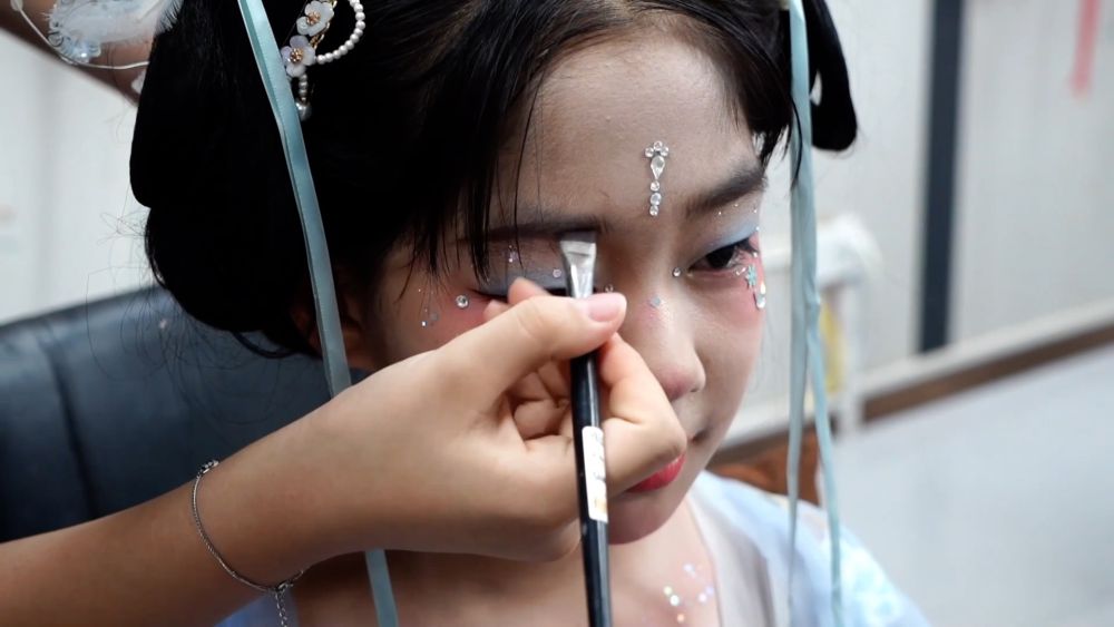 《凤舞神都》的实景演出以水幕为背景,将盛唐气象与现代科技完美融合。汉服体验馆内,妆造师正精心为顾客打造古风造型。