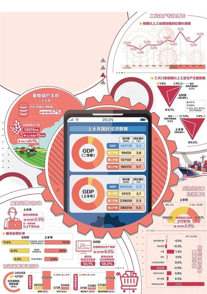 2025年上半年,中国经济顶压克难,在复杂“路况”中稳定前行,高质量发展向新向好,展现出强大韧性和活力。