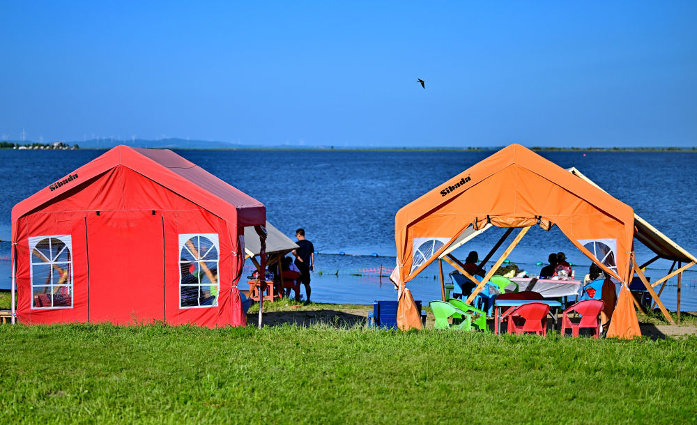 人们在哈尔滨市松花江畔的帐篷中消暑休闲(7月6日摄,无人机照片)。新华社发(杨威摄)
