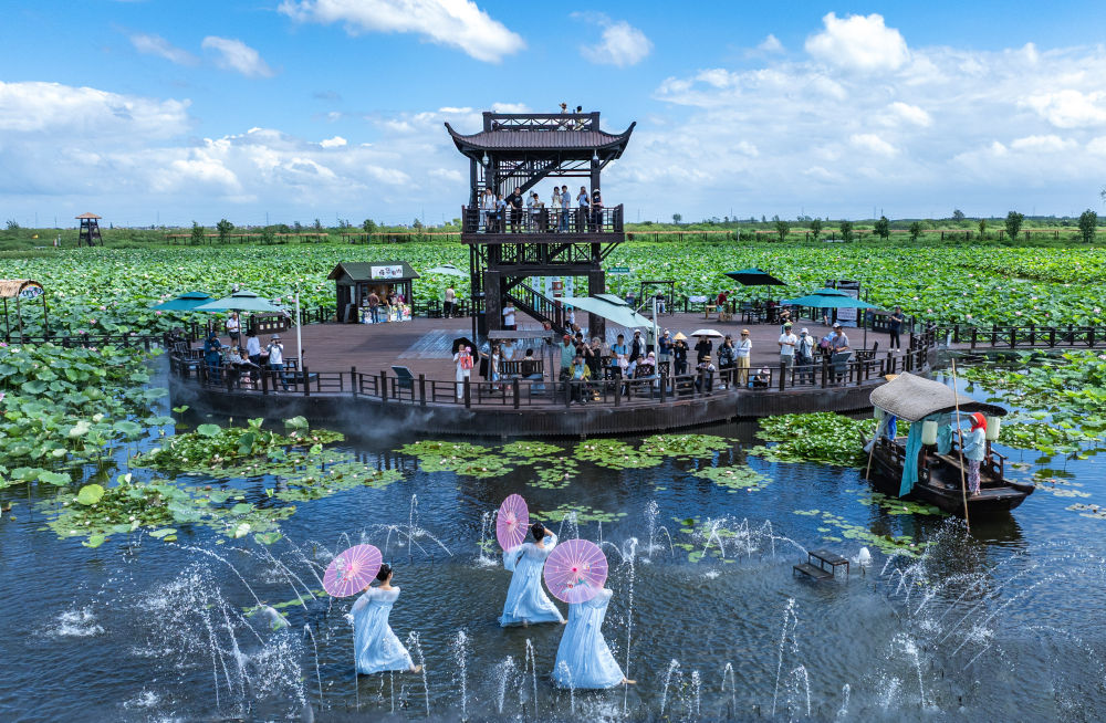 7月26日,游客在江苏省兴化市万亩荷塘景区观看表演(无人机照片)。新华社发(周社根摄)