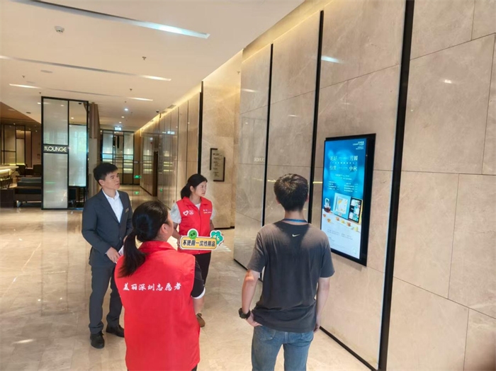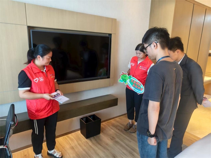 活动中,志愿者们结合《酒店垃圾分类工作指引》内容,面对面地向酒店工作人员传授垃圾分类知识,指导酒店工作人员准确分类,并引导入住客人正确分类,鼓励客人自己携带洗漱用品,减少一次性物品的使用。指导酒店在客房内设置可回收物、其他垃圾收集容器,餐厅不主动向客人提供一次性筷子、叉子、汤匙等餐具,宣传光盘行动,在酒店大堂、餐厅粘贴垃圾分类宣传标语和指引,引导客人主动践行绿色环保生活理念。