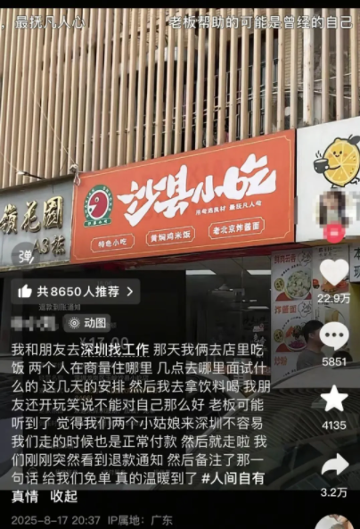 经询问,小吃店老板潘先生说:“是我的合伙人把钱退了。他跟我说,两个小女孩不容易。我就觉得这是一个善举。我妈当时听了也跟我说,她们出来能帮就帮一点。”