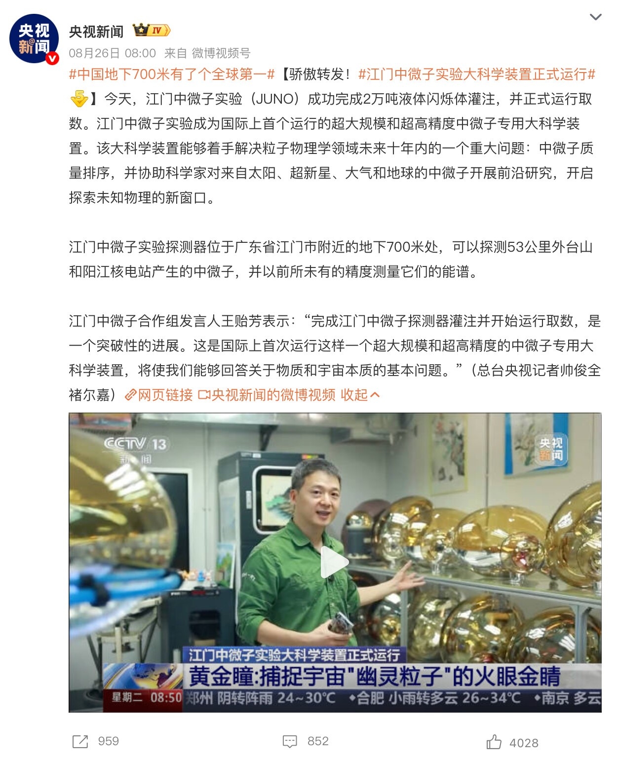 由中国科学院和广东省共同建设的江门中微子实验(JUNO),在广东省江门开平市成功完成2万吨液体闪烁体灌注并于8月26日正式运行取数。经过十余年的准备和建设,JUNO成为国际上首个建成的下一代大型中微子实验装置。这个用来捕捉有“幽灵粒子”之称的中微子的大科学装置,是国际上首次运行此类超大规模和超高精度的中微子专用大科学装置,使科学家能够回答关于物质和宇宙本质的基本问题。