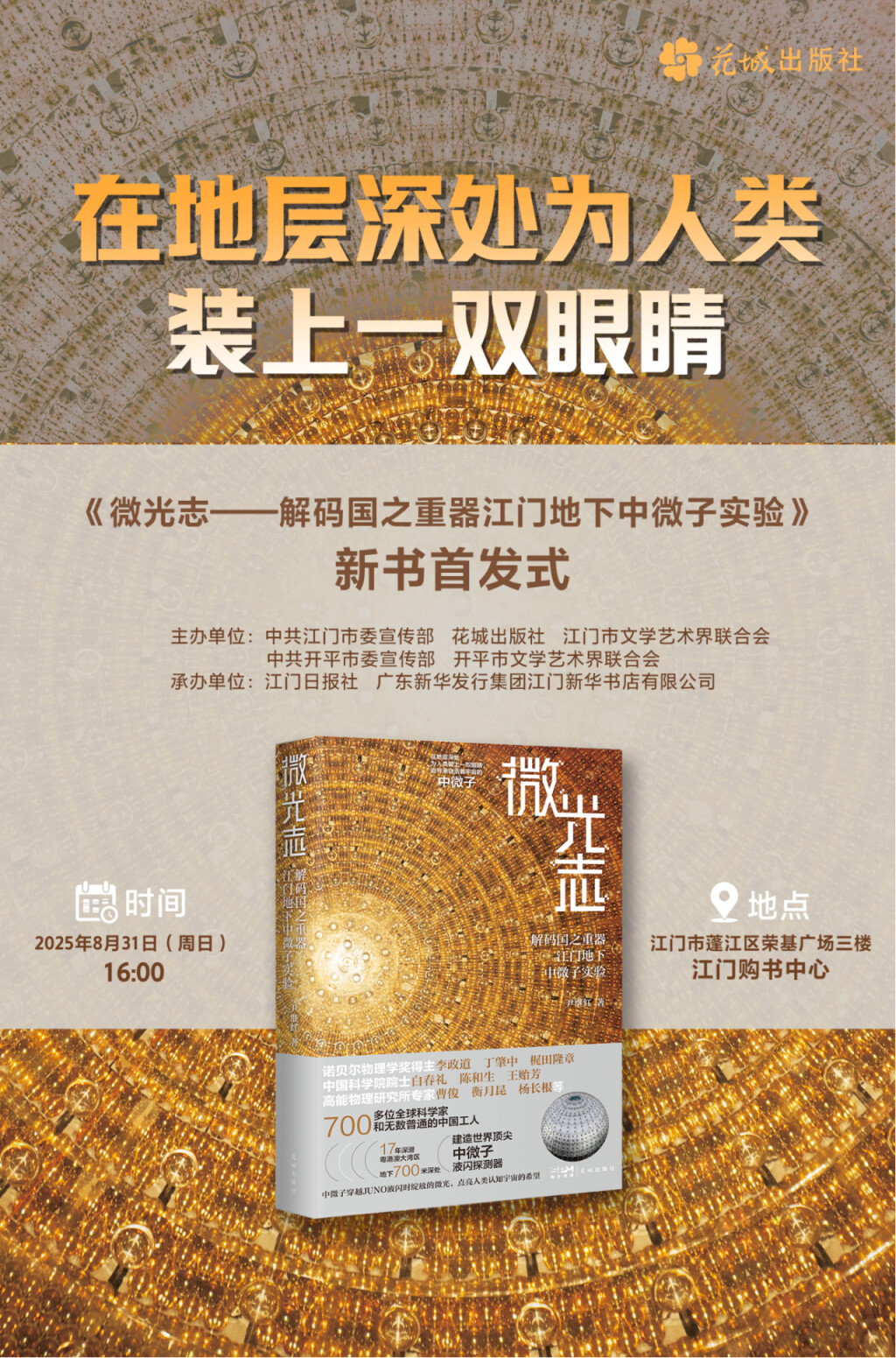 8月31日,《微光志——解码国之重器江门地下中微子实验》将在江门购书中心举行新书首发式,中国科学院高能物理研究所研究员、江门中微子实验副经理衡月昆,本书作者尹继红等将出席活动。