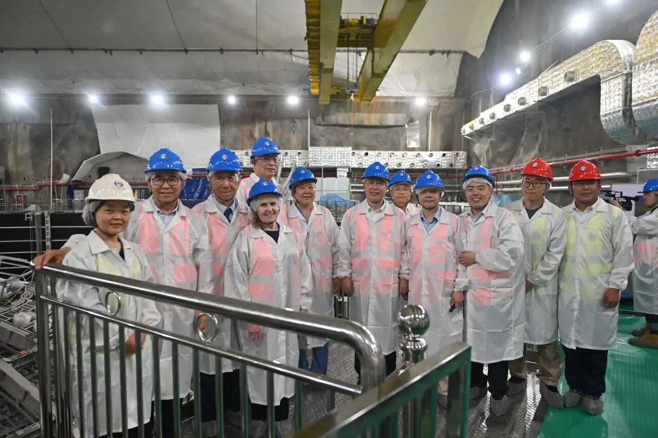 2023年5月22日,白春礼院长(左二)陪着世界著名物理学家、诺贝尔奖得主丁肇中先生(左三)参观江门地下中微子实验基地。在恩师丁肇中面前,王贻芳(右四)交上了一份合格的作业。