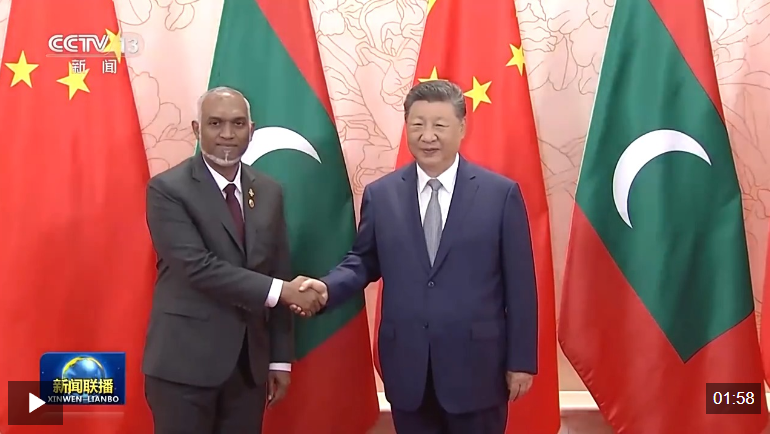 8月31日上午,国家主席习近平在天津迎宾馆会见来华出席2025年上海合作组织峰会和纪念中国人民抗日战争暨世界反法西斯战争胜利80周年活动的马尔代夫总统穆伊兹。