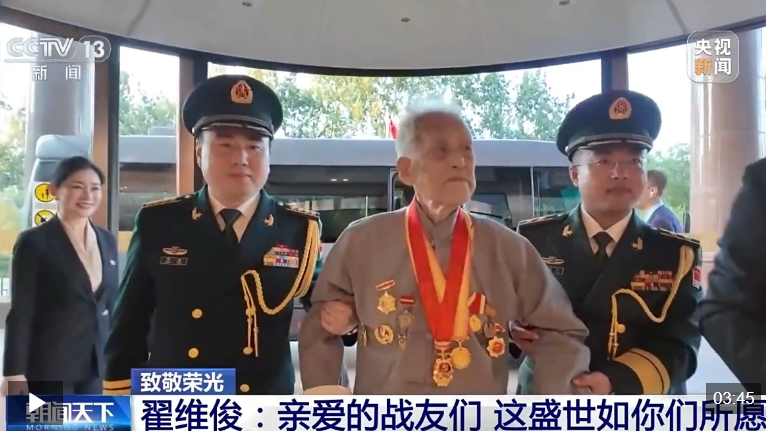 9月3日,纪念中国人民抗日战争暨世界反法西斯战争胜利80周年大会在北京隆重举行。现场观礼台上,有一位近百岁的老人——翟维俊。十年前,他曾在抗战老兵方队中乘车通过天安门接受检阅;今年,他作为支前模范代表,在观礼台上与抗战英雄们一起见证盛世。