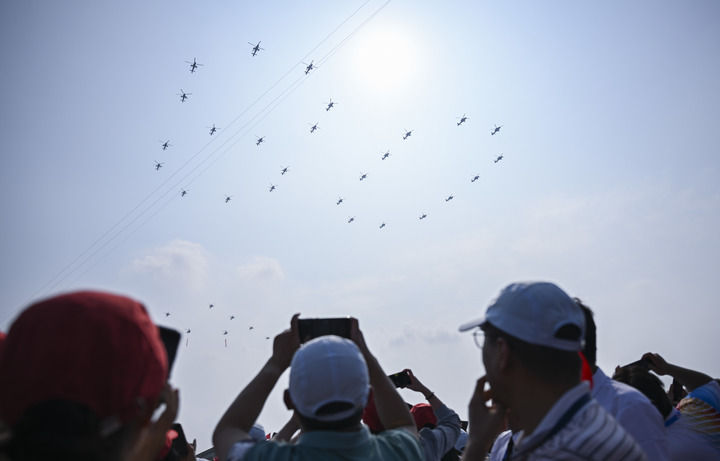9月3日,习近平总书记同来自五大洲的外国友人并肩站立在天安门城楼上。26架直升机组成巨大的“80”字样飞过,众人仰首凝望。