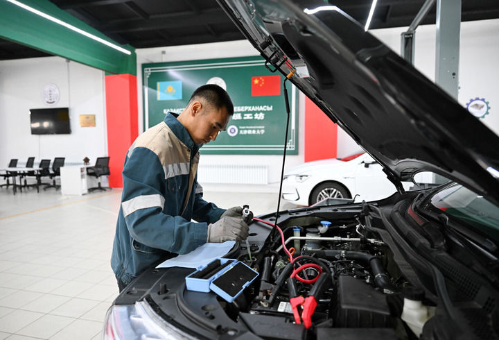2025年5月9日,在哈萨克斯坦东哈萨克斯坦州首府厄斯克门的鲁班工坊,学员练习汽车检修技能。新华社记者 李任滋 摄