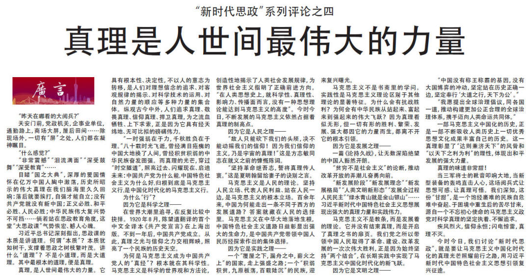 真理,是人世间最伟大的力量。它具有根本性、决定性,不以人的意志为转移,是人们对理想信念的追求、对客观规律的揭示、对科学技术的运用、对自然力量的顺应等多种力量的集合体。纵观古今中外,人们追求真理、敬畏真理、信仰真理、捍卫真理,为之流血牺牲、上下求索,正是因为它具有经天纬地、无可比拟的磅礴伟力。