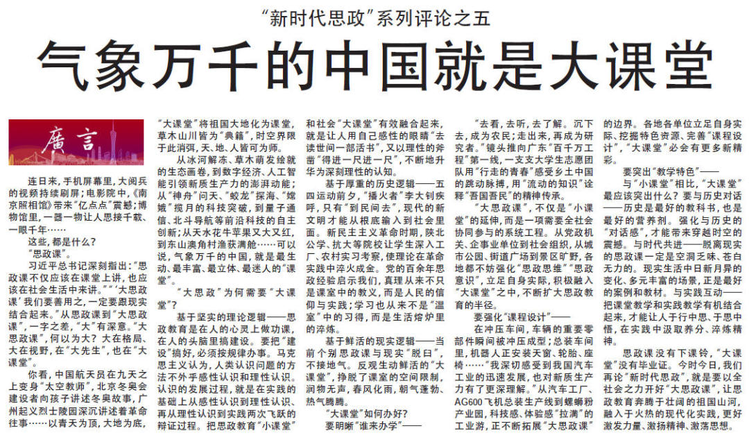 习近平总书记深刻指出:“思政课不仅应该在课堂上讲,也应该在社会生活中来讲。”“‘大思政课’我们要善用之,一定要跟现实结合起来。”从思政课到“大思政课”,一字之差,“大”有深意。“大思政课”,何以为大?大在格局、大在视野,在“大先生”,也在“大课堂”。【全文】