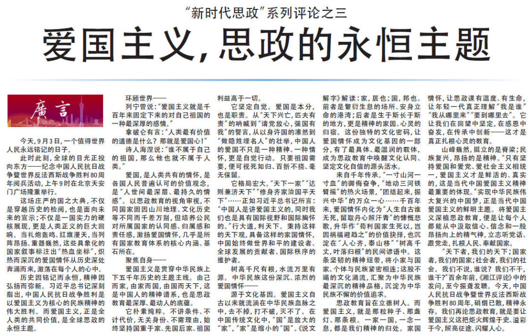 “天下者,我们的天下;国家者,我们的国家;社会者,我们的社会。我们不说,谁说?我们不干,谁干?”百余年前,《湘江评论》中的发问,至今振聋发聩。今天,中国人民抗日战争暨世界反法西斯战争胜利80周年,硝烟已散,精神永存。我们再论思政教育,就是要让爱国主义这把炬火辉煌于史、溢彩于今,照亮征途、闪耀人心。【全文】