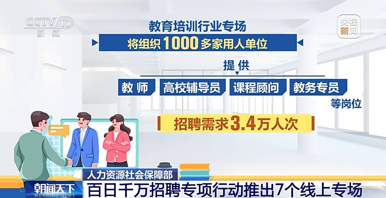 教育培训行业专场将组织1000多家用人单位,提供教师、高校辅导员、课程顾问、教务专员等岗位,招聘需求3.4万人次。