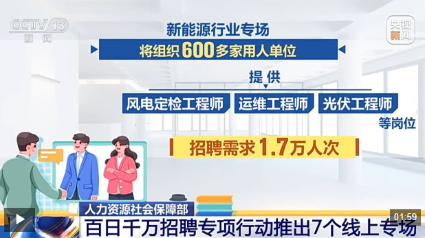 新能源行业专场将组织600多家用人单位,提供风电定检工程师、运维工程师、光伏工程师等岗位,招聘需求1.7万人次。