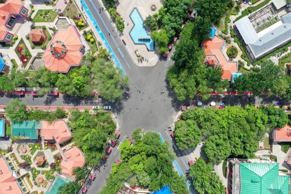 在伊犁哈萨克自治州伊宁市拍摄的六星街景区中心广场(无人机照片)。新华社记者 丁磊 摄