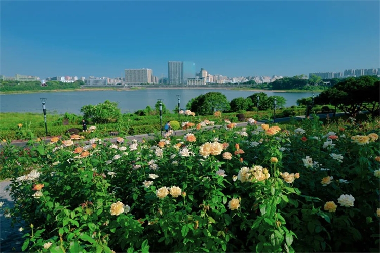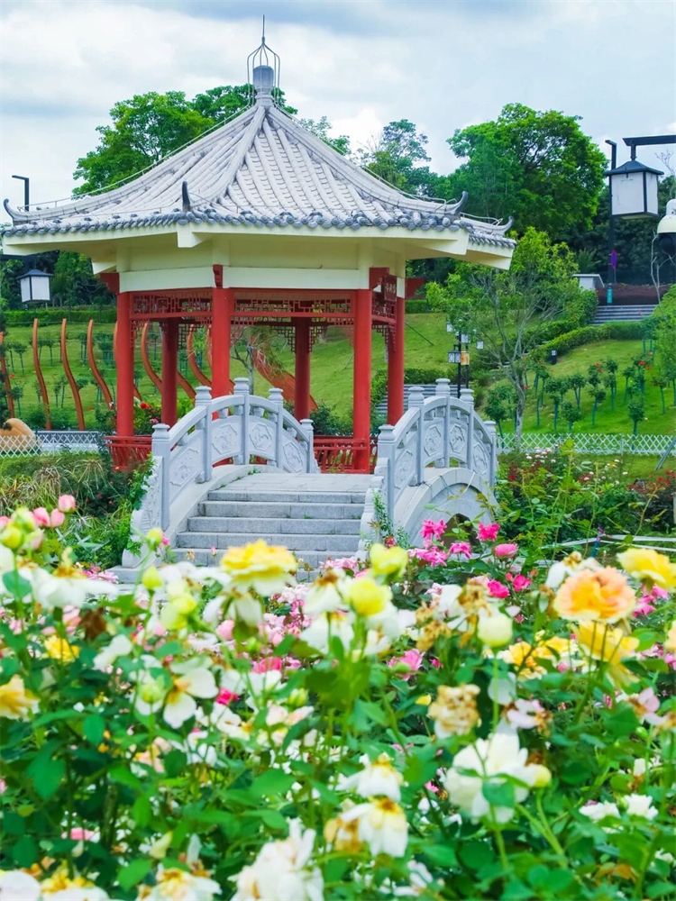 公园内有着层层叠叠的月季花海。红色、黄色、粉色的月季花团灿似云霞,清风徐来,花香四溢,陶醉在油画般的美景里,让人挪不动步伐。