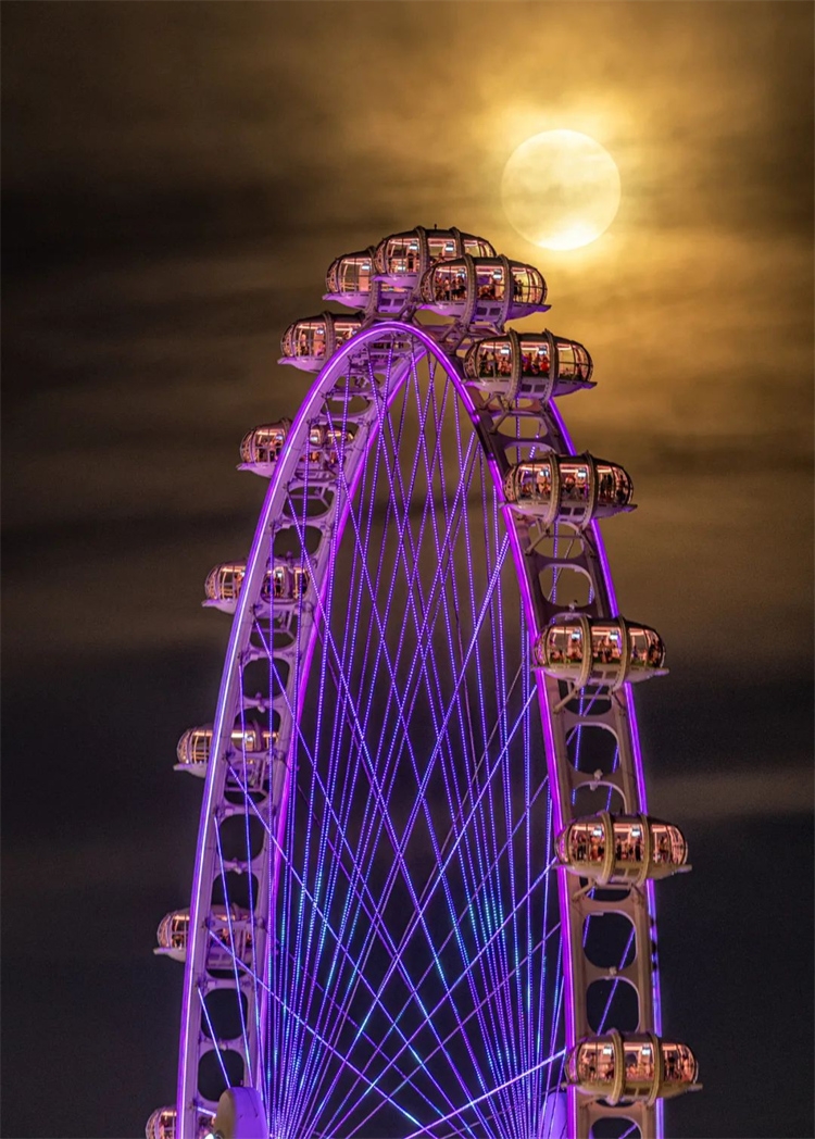 超大圆月从摩天轮背后缓缓升起,随着摩天轮的运转,感觉自己离明月越来越近,中秋可以来这里体验一下不同寻常的赏月。