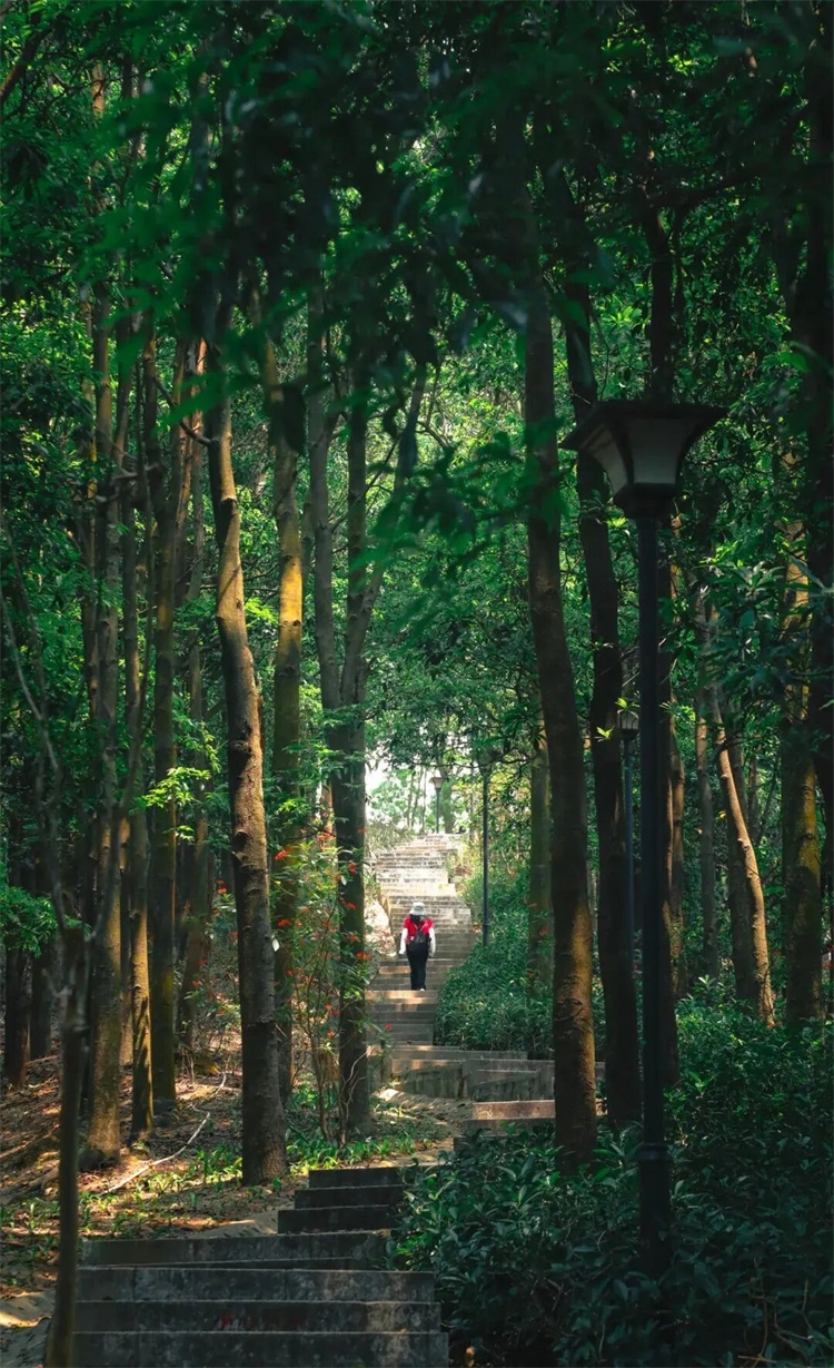 从广场出发沿着缓步道拾级而上,一路上便可欣赏到山高林茂、绿水长流的旖旎风光,尽享自然山川情趣。