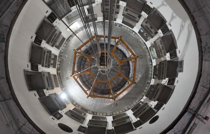 这是2025年10月1日在安徽合肥未来大科学城紧凑型聚变能实验装置(BEST)建设现场拍摄的成功落位安装的杜瓦底座(无人机照片)。新华社记者 周牧 摄