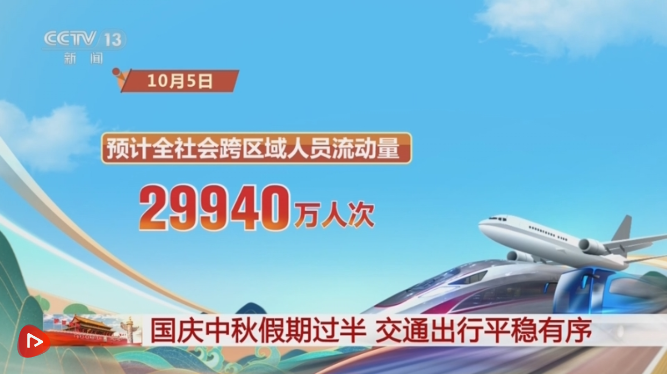 央视网消息:记者从交通运输部了解到,10月5日预计全社会跨区域人员流动量超2.99亿人次,同比增长6.3%。从9月29日到10月4日,铁路累计发送旅客超过1亿人次,运输安全平稳有序。10月5日铁路客流继续保持高位运行,中短途客流持续增多。铁路客运量预计1755万人次。