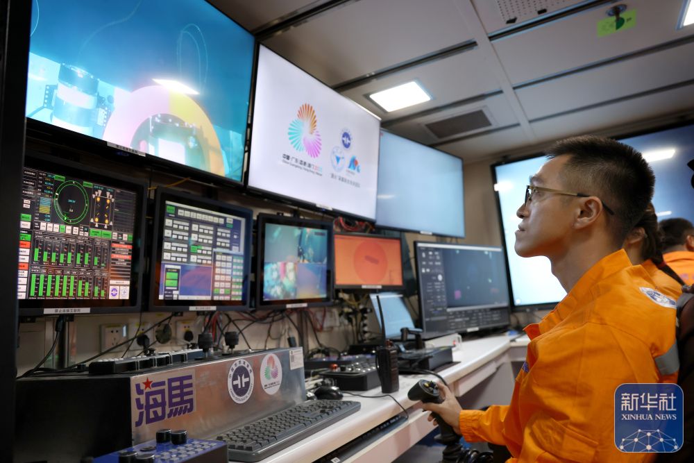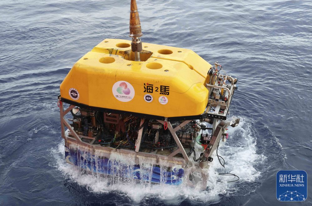 ↑9月18日,“海洋地质二号”科考船搭载“海马”号深海遥控潜水器在南海北部进行“源火”采集。新华社记者 卢汉欣 摄