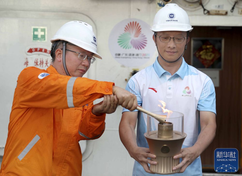↑9月18日,在科考船甲板面,“源火”采集组副组长,广州海洋地质调查局副总工程师沙志彬(左)用引火棒将“源火”转移至“源火”盒。新华社记者 卢汉欣 摄