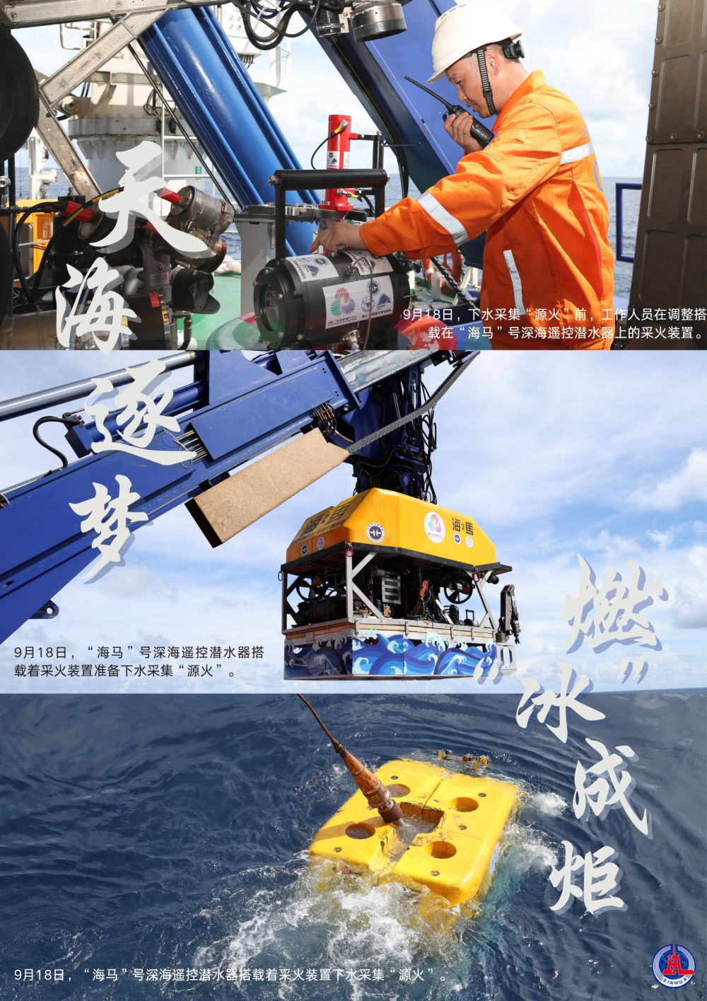 ↑9月18日 采火装置在海底成功引燃“源火”。(广州海洋地质调查局供图,闫樨霖 摄)