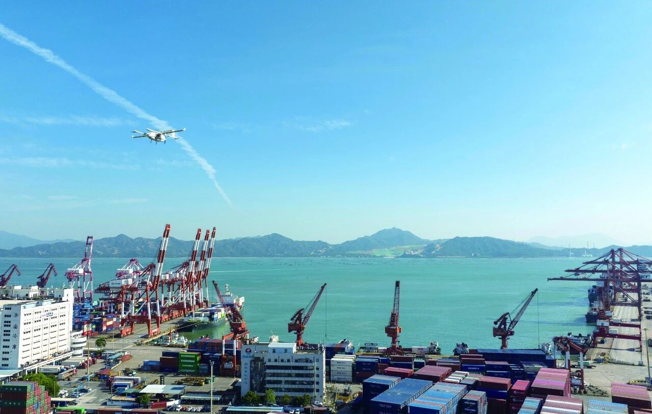 一架无人机搭载快件从珠海飞抵深圳蛇口集装箱码头。(广东省人大常委会办公厅供图)