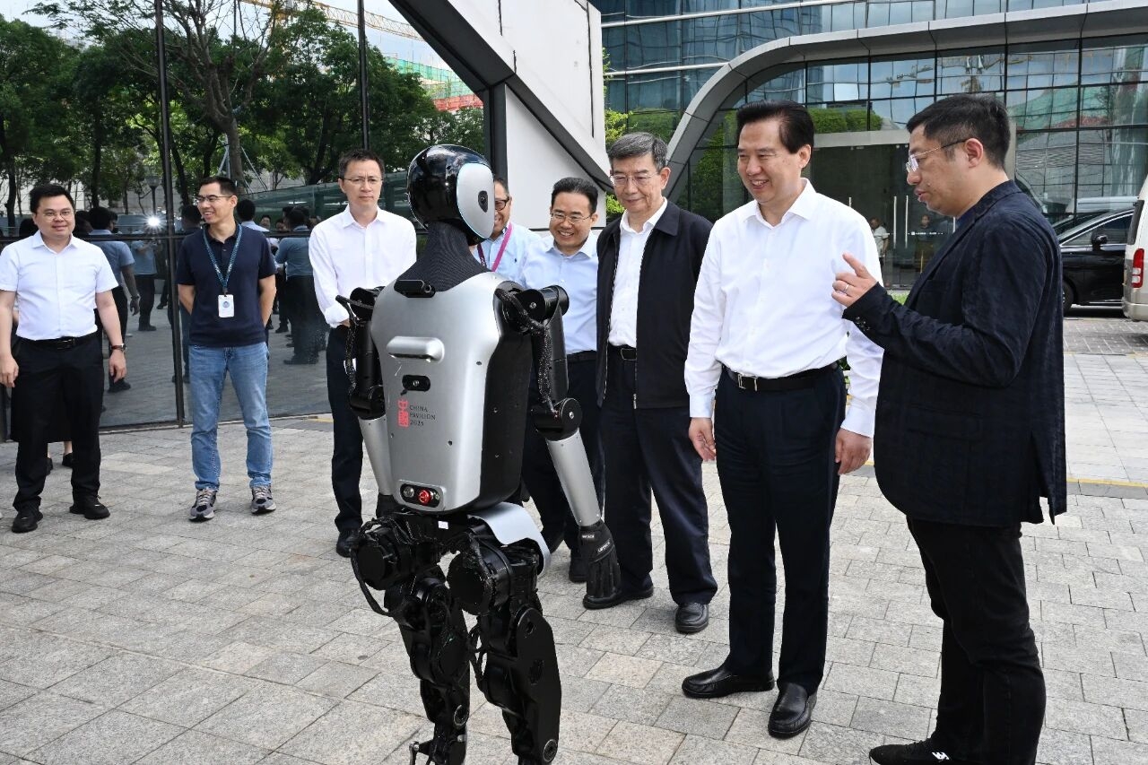 广东省人大常委会主任黄楚平(右二)调研人工智能与机器人产业。(广东省人大常委会办公厅供图)
