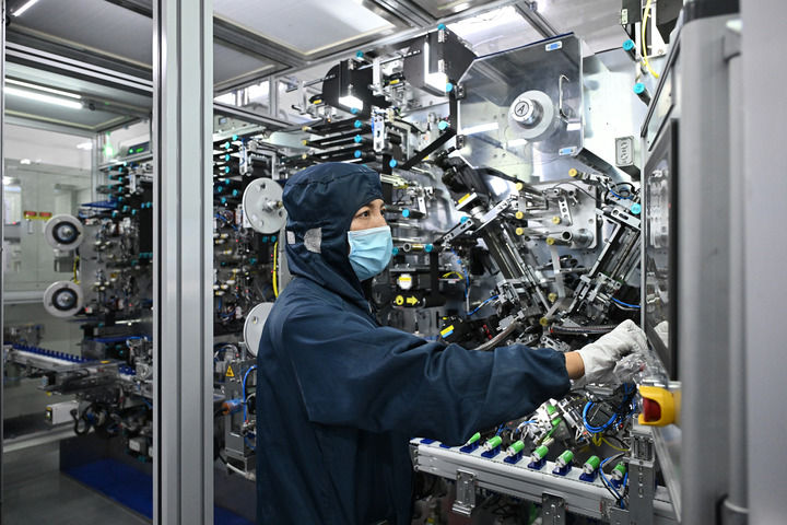 在山西阳泉,华阳新材料科技集团华钠芯能科技有限责任公司的工作人员在操控设备(2024年7月31日摄)。新华社记者 李鑫 摄