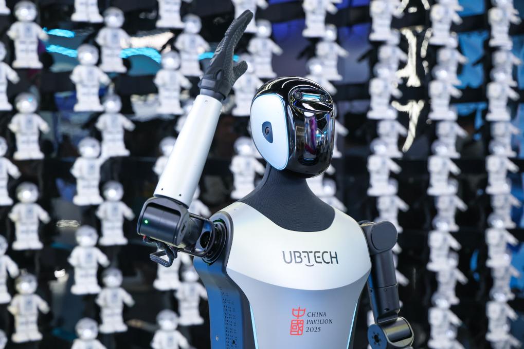 △2025年4月23日,在深圳优必选科技展厅内,商用版人形机器人Walker C向观众挥手致意。
