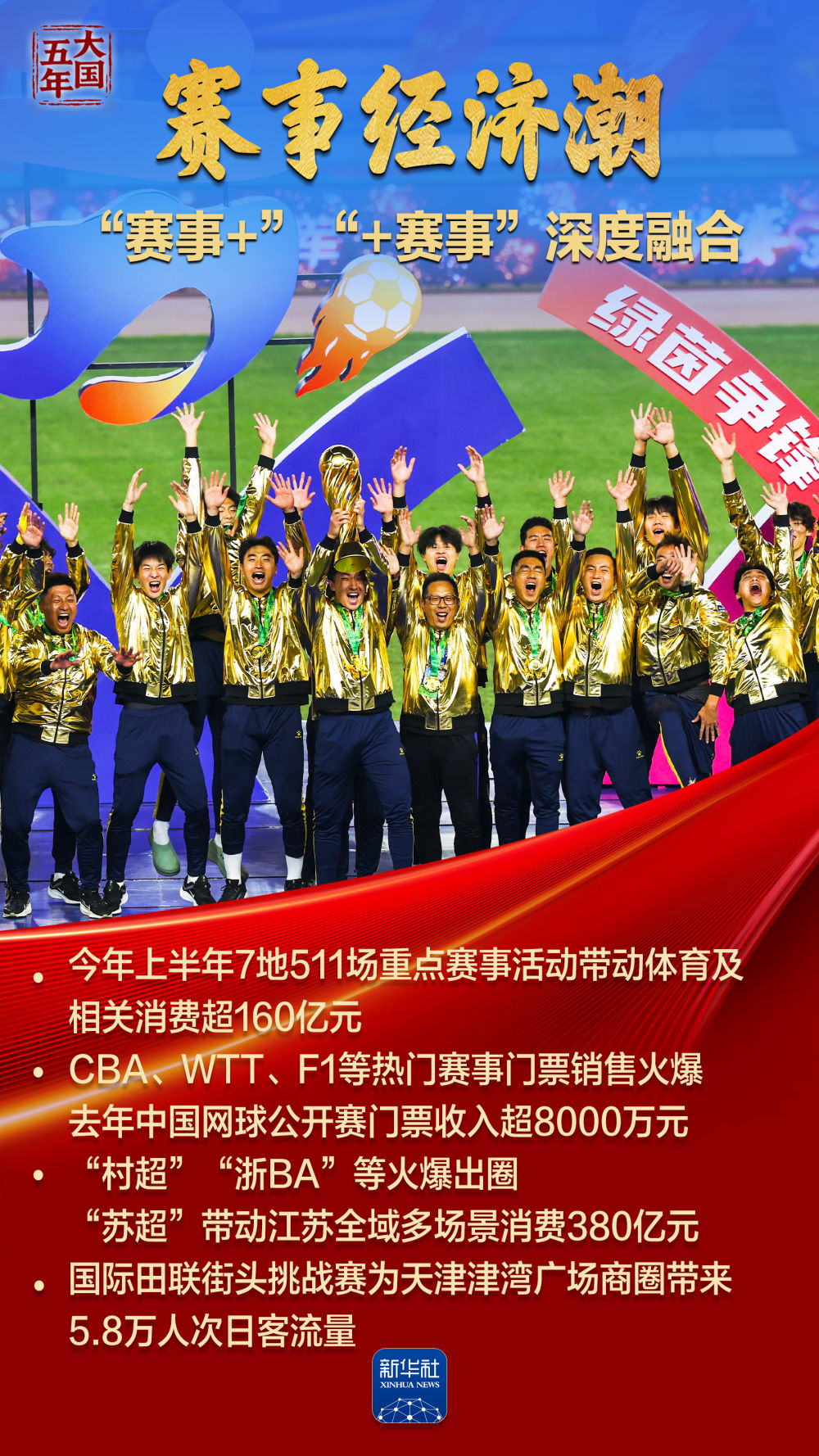 竞技场上,国旗频升国歌频传,体育健儿写下“体育大国”“奥运强国”最精彩篇章;公园里巷,全民健身,“轻体育”生活成为“健康中国”新风尚;“村超”“苏超”好戏连台、热火朝天,普通人成为新主角;新业态、新消费迸发无限活力,体育经济亿万规模助力国民经济……