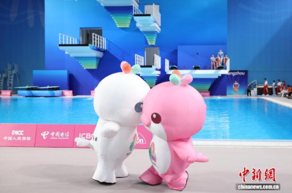 11月11日,第十五届全国运动会跳水项目女子3米跳板决赛在广东省奥体中心游泳跳水馆举行。图为比赛前,十五运会吉祥物带来暖场表演。 中新社记者 陈楚红 摄