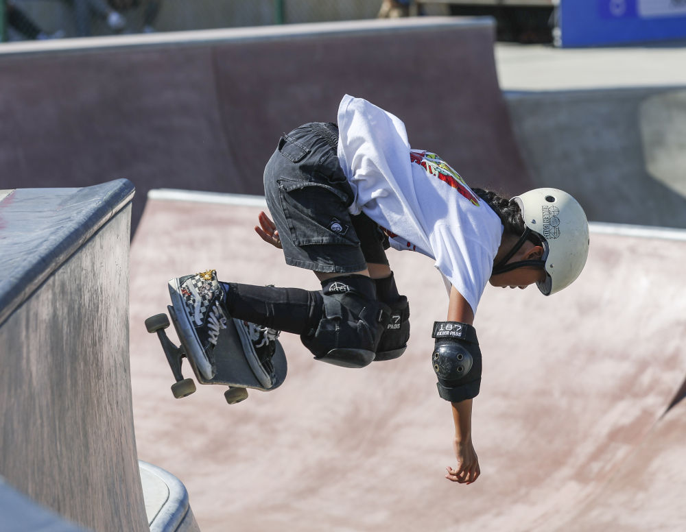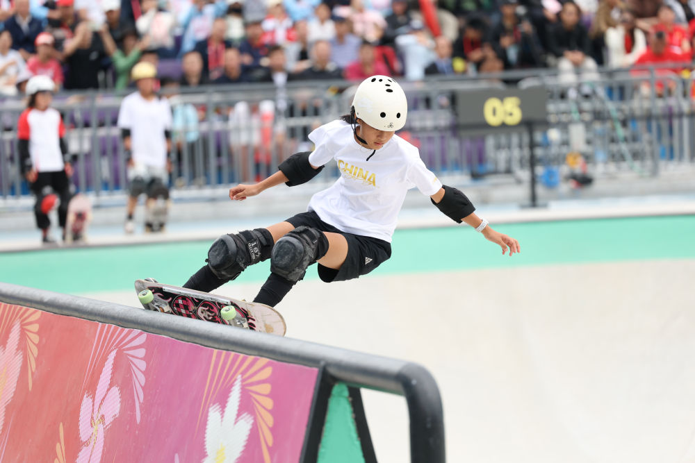 2023年11月4日,第一届全国学生(青年)运动会滑板女子碗池决赛在广西北海举行,郑好好获得亚军。新华社记者 胡星宇 摄