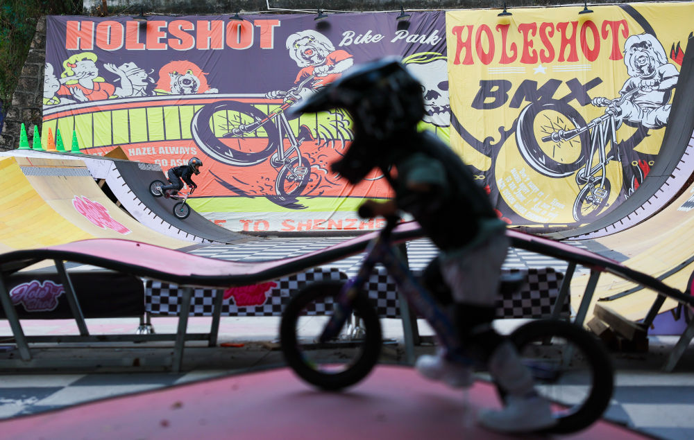 10月31日,在位于深圳福田区的HOLE SHOT骑行公园,小朋友们练习小轮车。新华社记者 胡星宇 摄