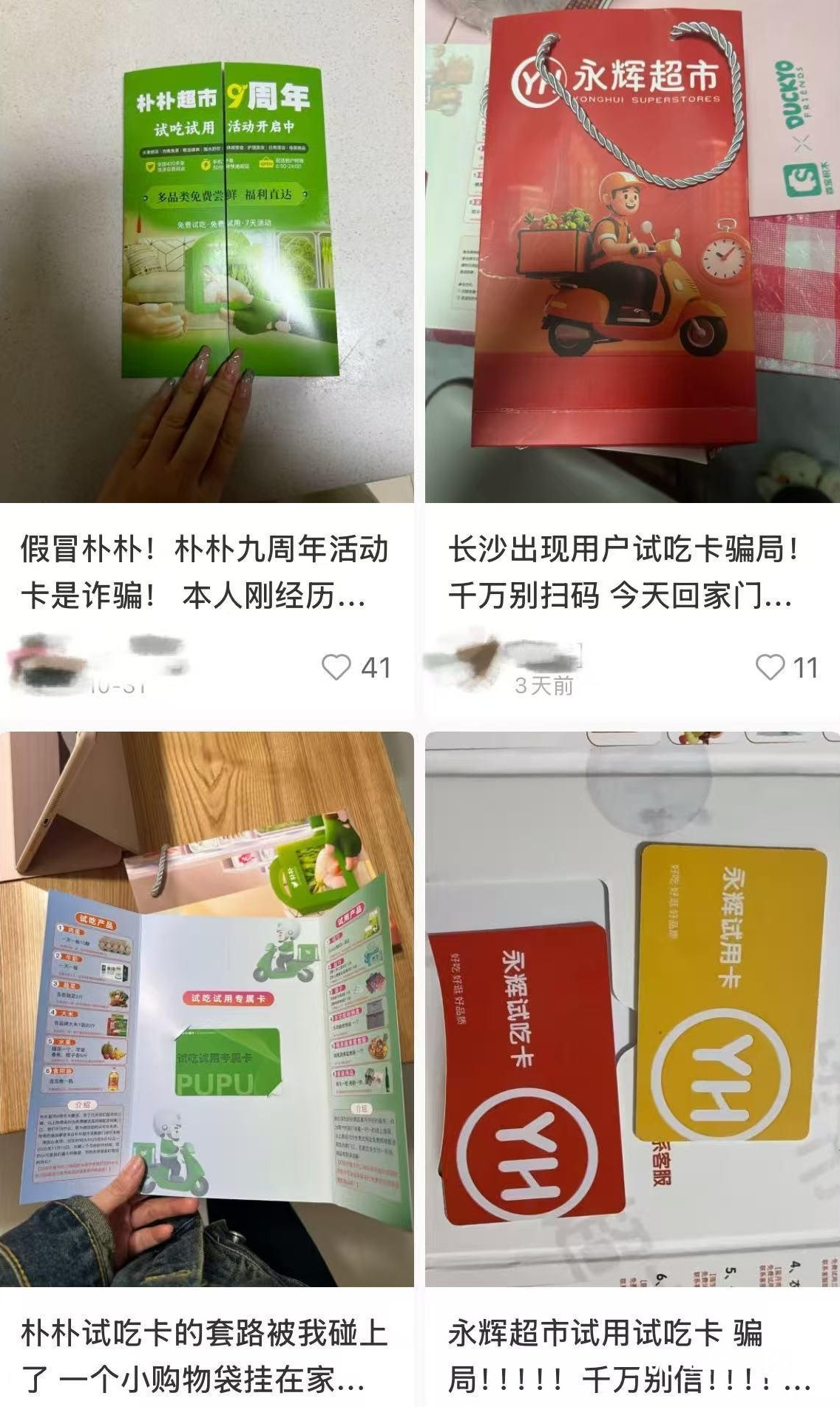 除了盒马外,近日,多位网友还集中反映称,收到了朴朴、大润发、永辉超市等平台的免费试吃卡、免费体验卡等,网友表示这些物品是直接挂在每家每户的门口。