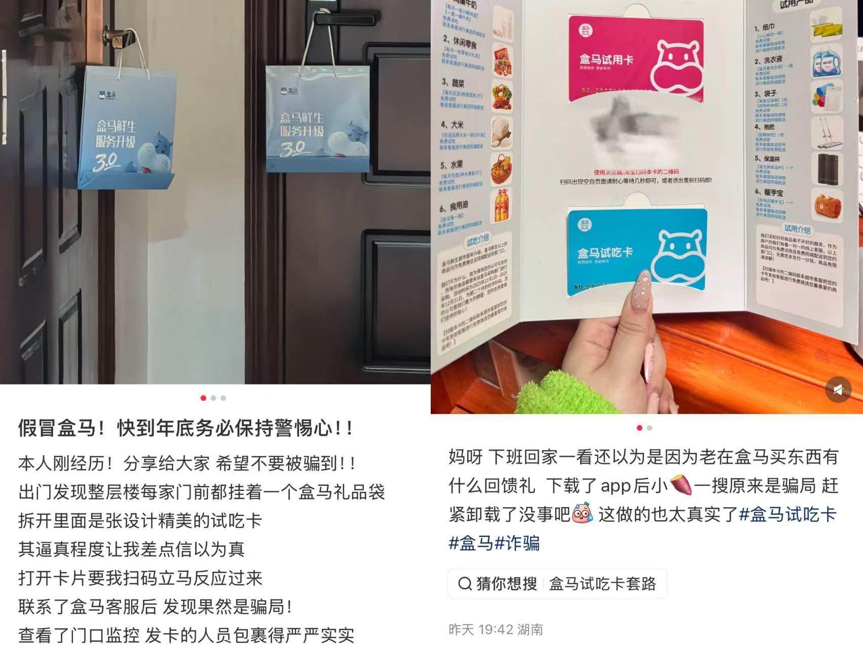 近日,多名网友于社交平台发文称,在家门口发现一个盒马礼品袋,里面装着盒马试用卡和盒马试吃卡,附带的宣传单张显示,消费者扫描卡上的二维码可以免费试吃及领取生活用品,产品包括纸巾、洗衣液、鸡蛋、牛奶、食用油等。