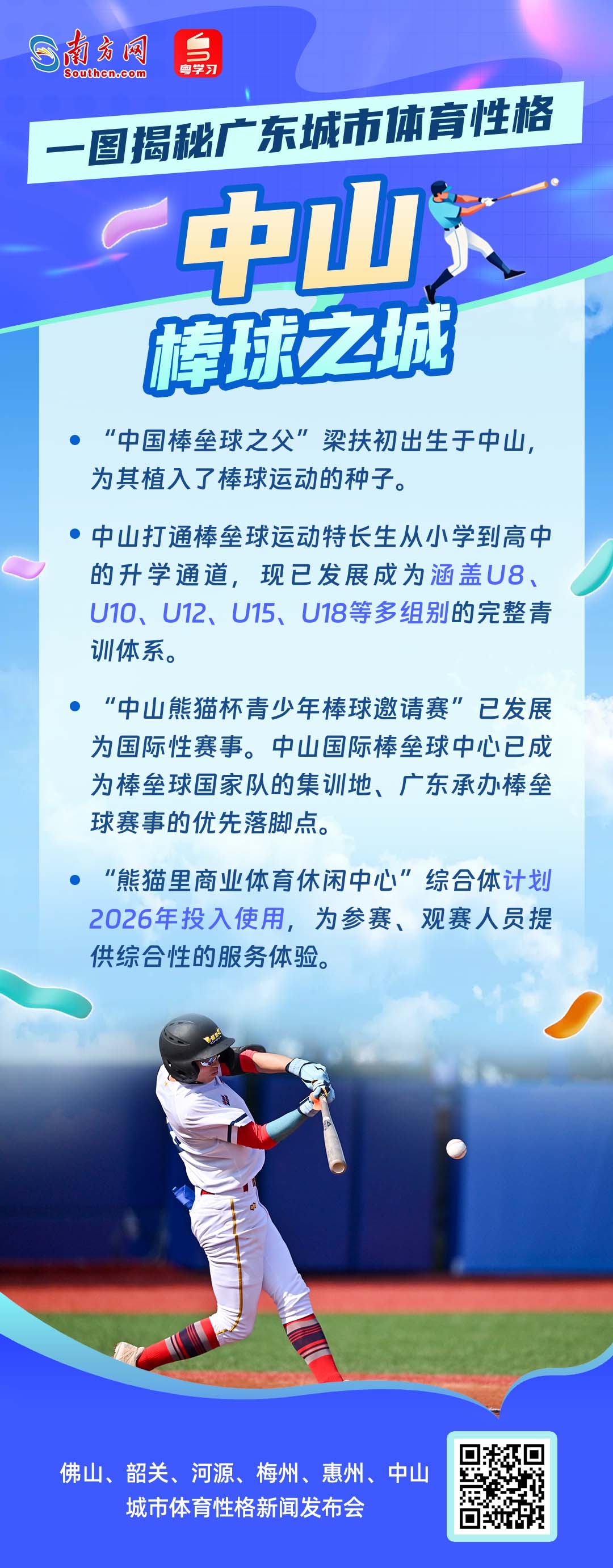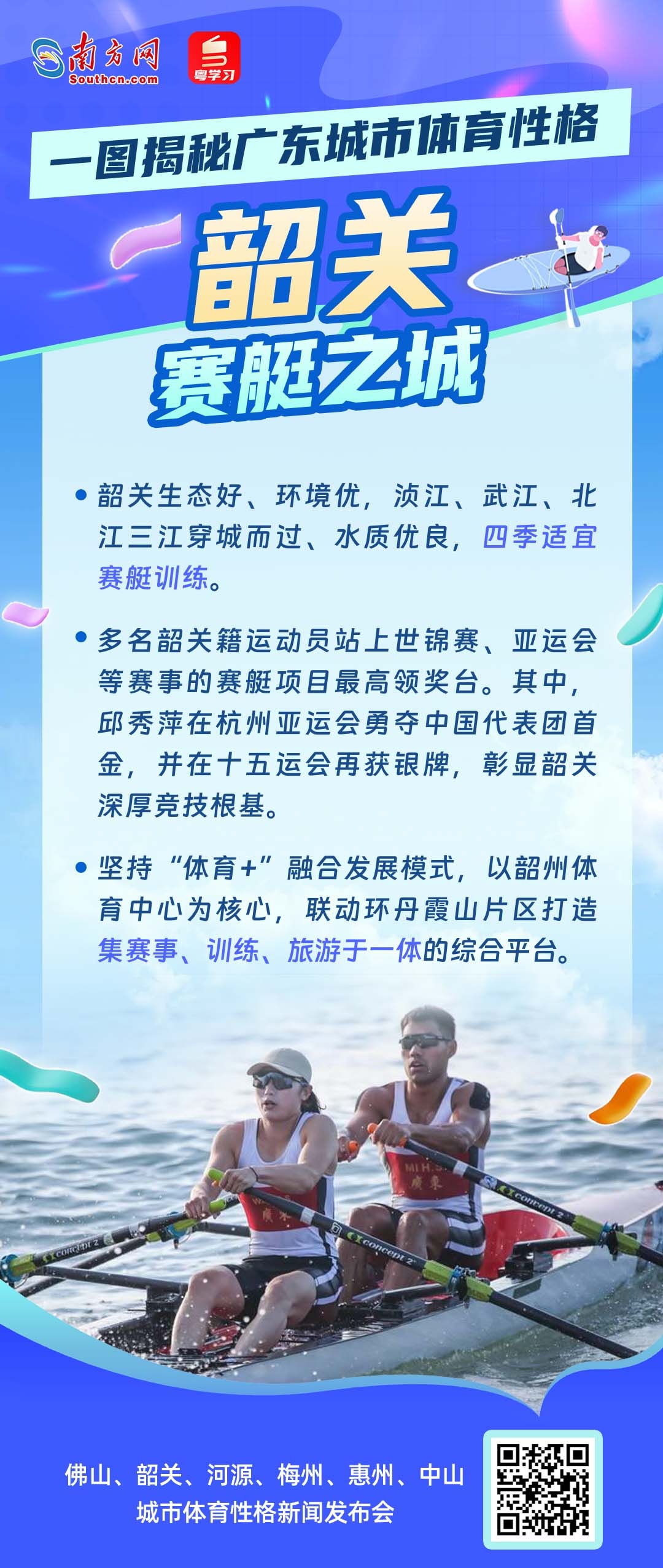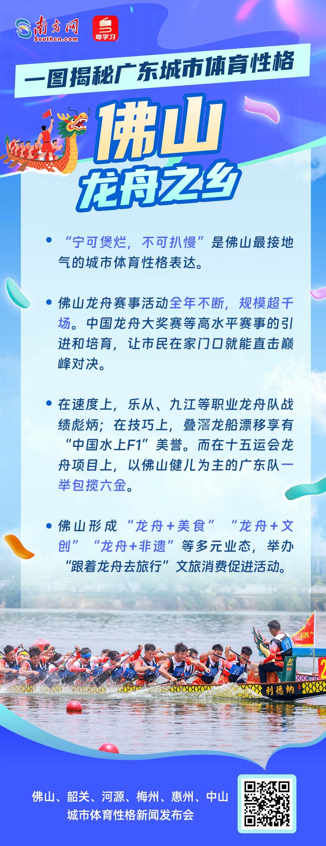 11月16日10时,十五运会广东赛区执委会举行新闻发布会,邀请佛山、韶关、河源、梅州、惠州、中山六市人民政府负责人,共同介绍城市体育性格、赛事运行保障、体育产业等情况。这不仅是一场体育与城市的对话,更是广东践行“办好一次会,提升一座城”理念,展现高质量发展风貌的生动实践。从龙舟竞速到赛艇劈波,从徒步山水到绿茵驰骋,从滑板飞扬到棒球热血——每一座城,都有一种体育精神在脉动;每一种热爱,都在为“活力广东”写下生动注脚。你的家乡,究竟属于哪种“活力派”?让我们通过一组海报,一起走进六座城市的体育性格,感受岭南大地的运动基因与城市魅力!