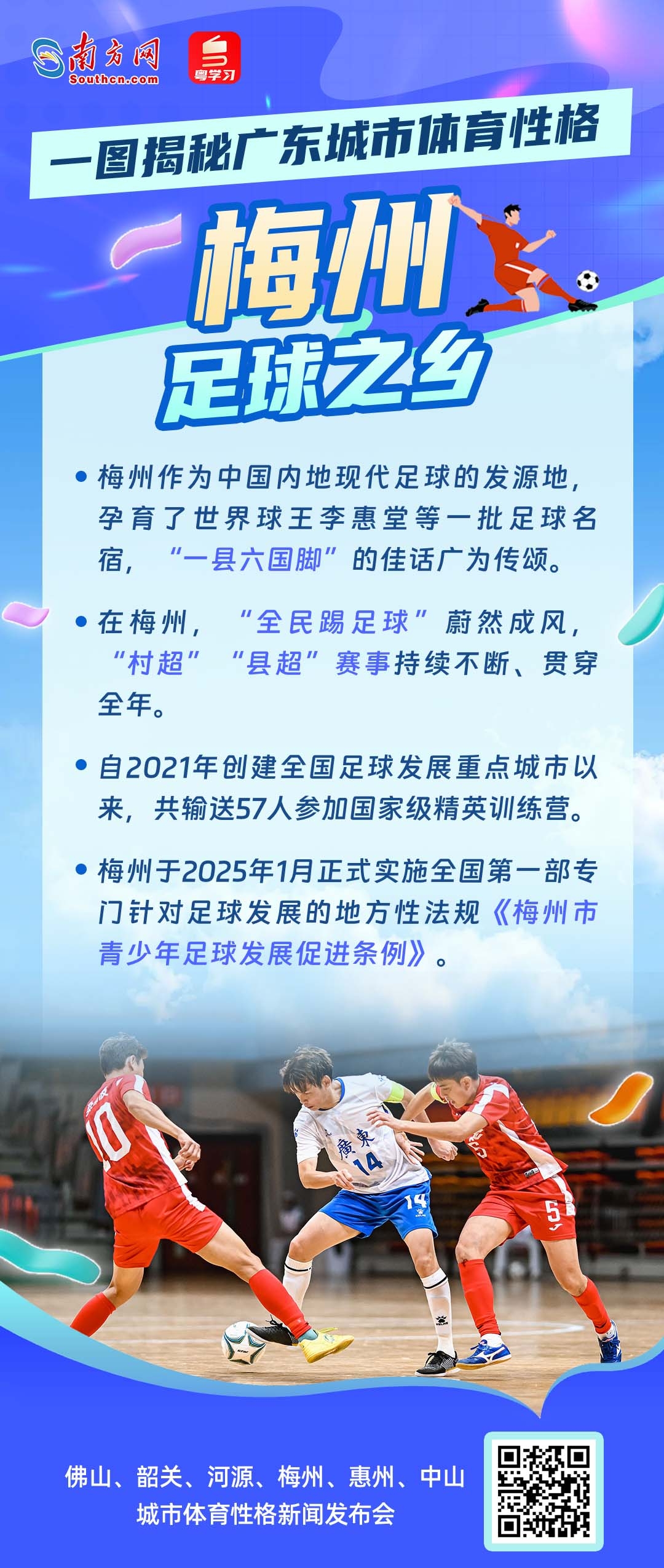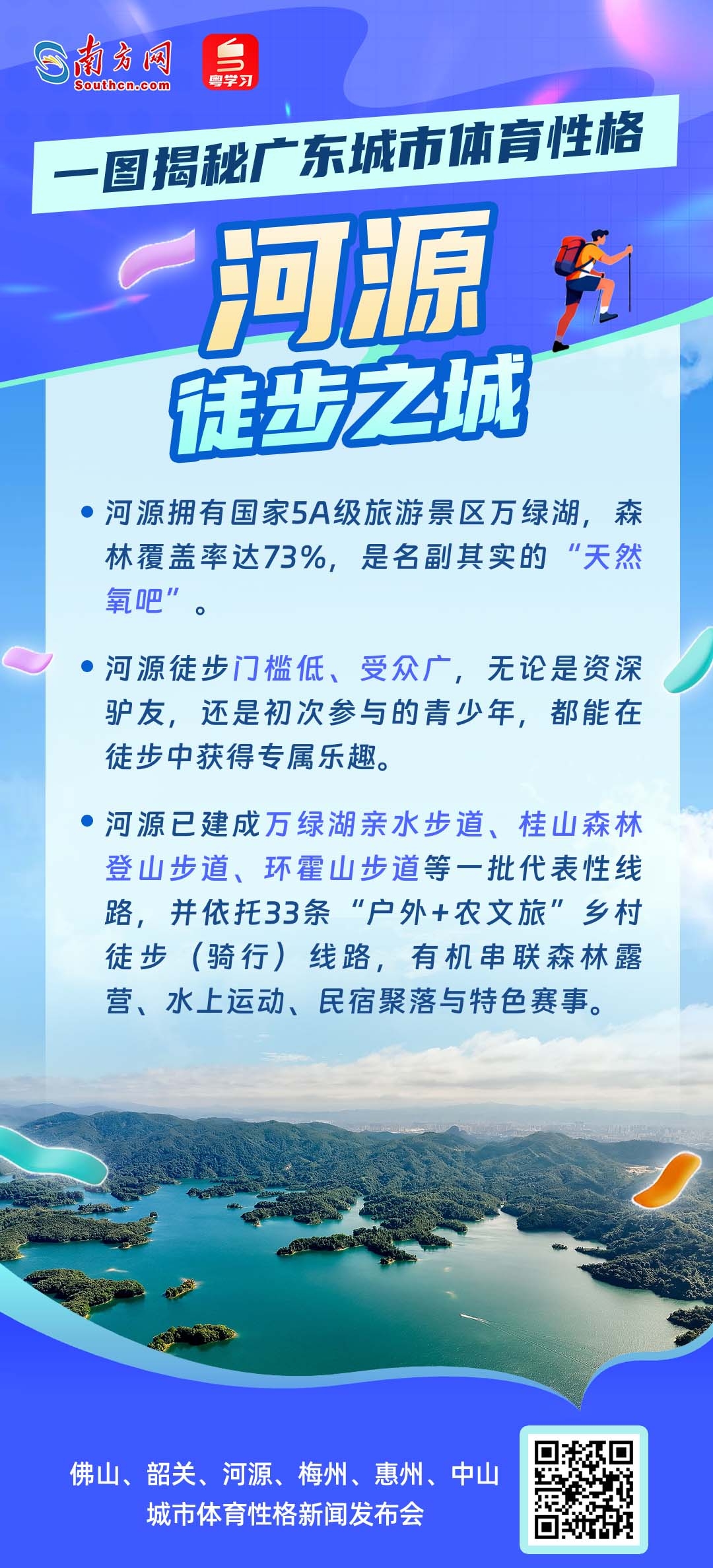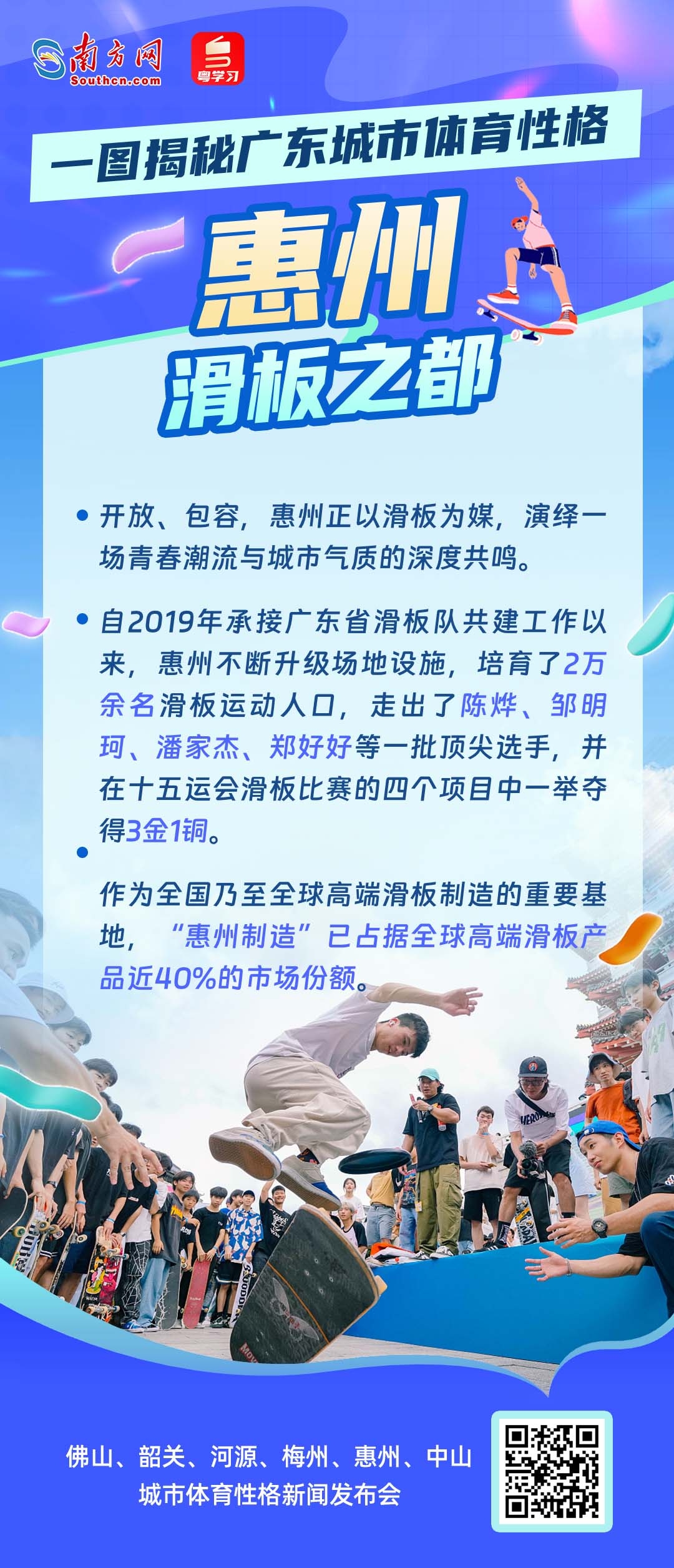 11月16日10时,十五运会广东赛区执委会举行新闻发布会,邀请佛山、韶关、河源、梅州、惠州、中山六市人民政府负责人,共同介绍城市体育性格、赛事运行保障、体育产业等情况。这不仅是一场体育与城市的对话,更是广东践行“办好一次会,提升一座城”理念,展现高质量发展风貌的生动实践。从龙舟竞速到赛艇劈波,从徒步山水到绿茵驰骋,从滑板飞扬到棒球热血——每一座城,都有一种体育精神在脉动;每一种热爱,都在为“活力广东”写下生动注脚。你的家乡,究竟属于哪种“活力派”?让我们通过一组海报,一起走进六座城市的体育性格,感受岭南大地的运动基因与城市魅力!