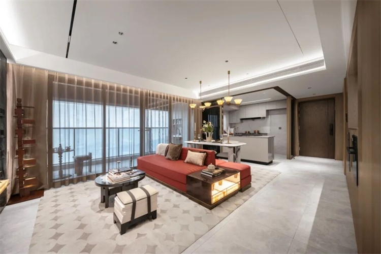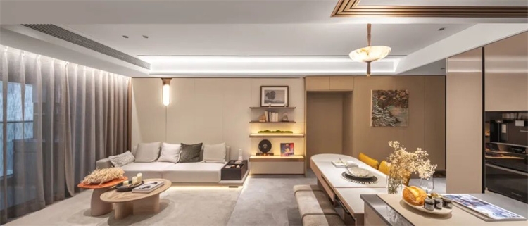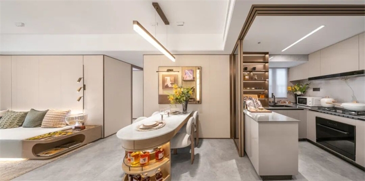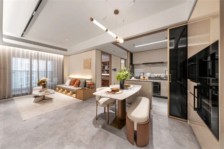 在空间细节上,该户型同样亮点十足:豪宅级L型洄游厅设计,餐厨一体的动线优化,配合新增的餐边柜收纳系统,让客餐厅的使用效率更高,目测最大可形成约40㎡的巨厅空间,媲美约120㎡以上的改善型户型;双卧室配备270°全景飘窗,采光面较普通飘窗增加一倍,午后阳光可洒满房间,提升居住幸福感;独立健康玄关模块预留了消杀与收纳系统,在注重健康的当下更具实用性。这种“一步到位”的户型设计,让新中产无需因家庭结构变化频繁换房,既节省了置换成本,又避免了搬家的麻烦。
