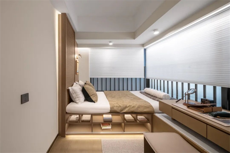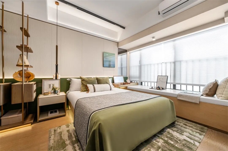更令人惊喜的是空间利用率的极致提升:全屋飘窗设计,主卧、次卧的飘窗不仅增加了采光面,更可改造为储物空间或休闲角落,得房率超90%,让约83㎡的户型呈现出近90㎡的空间感。对于预算有限的新中产而言,这种“小面积、全功能”的设计,既降低了购房总价,又保证了居住舒适度,完美平衡了性价比与实用性。