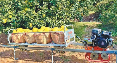 南福金柚种植基地,单轨山地果园运输机正在工作中。