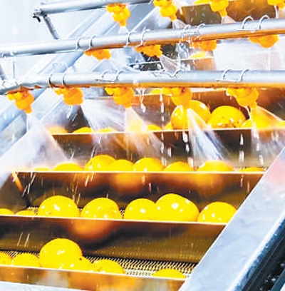 在浙江艾佳果蔬开发有限责任公司,胡柚正在生产线上进行清洗。