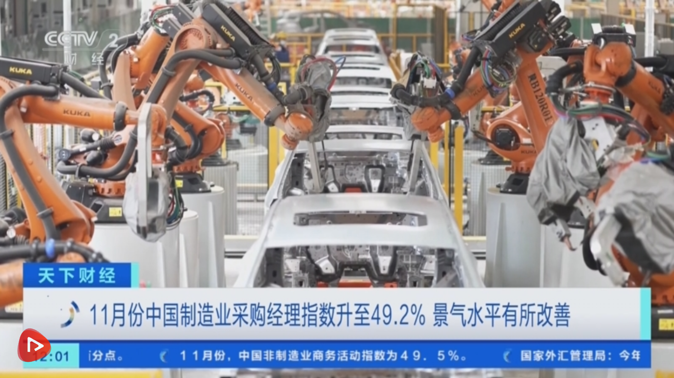 央视网消息:国家统计局、中国物流与采购联合会11月30日联合发布的数据显示,11月份,中国制造业采购经理指数(PMI)为49.2%,比上月上升0.2个百分点;制造业景气水平有所改善。