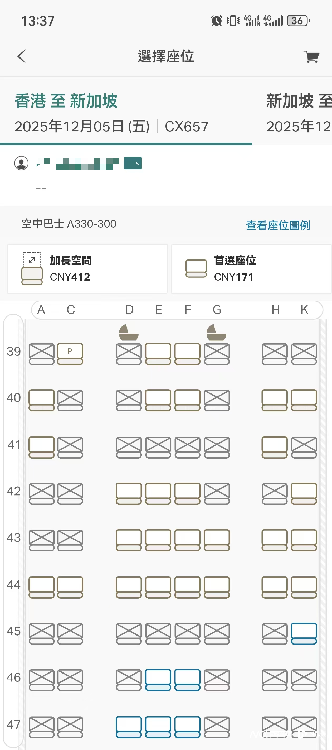 她购买了国泰航空的航班,计划12月5日飞往新加坡游玩。她所面临的情况是,在等待进入48小时的选座时段前,她看到座位对应的图标越来越多地变成灰色、加上“叉叉”符号,成为被锁定的座位。过程中,她若是想拿下心仪的座位,需要付出费用,价格为93元至412元不等。