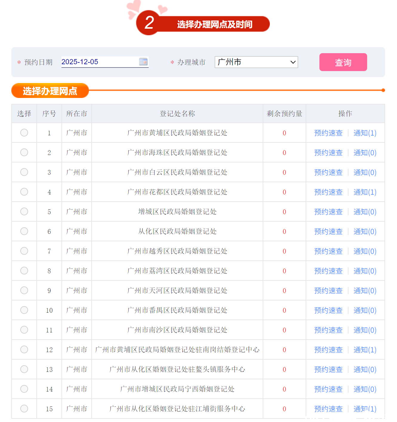 12月1日上午,南都记者在广东民政婚姻登记网上预约系统看到,以广州为例,本周工作日结婚预约号量较为充足,而到了周六,结婚预约号则只剩下其中一个登记处有少量号源。