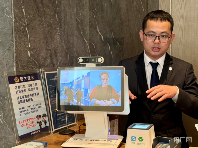 接待酒店工作人员现场演示手语翻译机,通过屏幕实时连线手语老师,实现无障碍沟通(央广网记者罗世伟 摄)