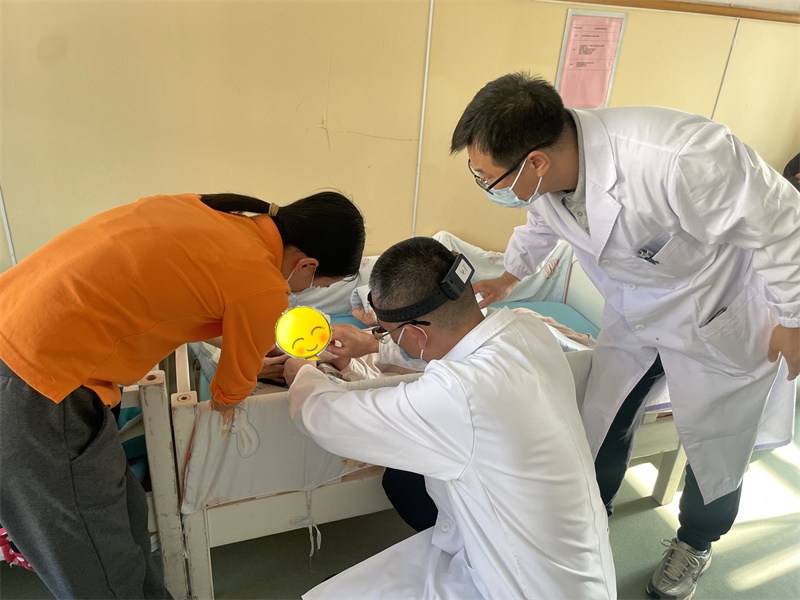 与此同时,在另一侧的义诊区域,医院耳鼻喉科第九党支部书记高进良带领两名医务人员,耐心细致地为孩子们进行健康检查。他们逐一为孩子们检查耳鼻喉健康状况,认真解答相关问题,并为有需要的孩子提供专业的医疗建议。