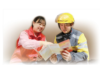 河南郑州,外卖员王光辉(右)在工会驿站了解保障政策。